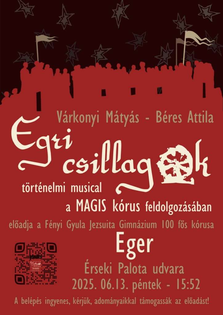 Az Egri Érseki Palota Turisztikai és Látogatóközpont és a Fényi Gyula Jezsuita Gimnázium sok szeretettel meghívja Önt és kedves családját az Érseki Palota díszudvarán tartandó Várkonyi Mátyás – Béres Attila – Egri Csillagok történelmi musical előadásra . A rendezvénnyel kapcsolatos részleteket a plakát tartalmazza.
