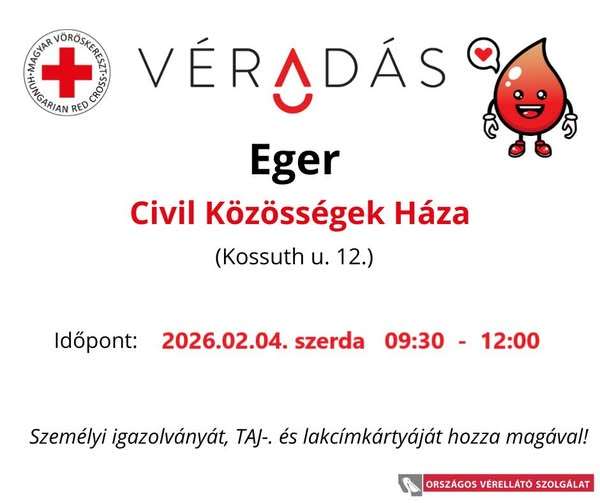 Február hónapban visszatér Egerben a megszokott helyszínre a Civil Közösségek Házában a Kossuth u. 12. sz alatt a véradás.