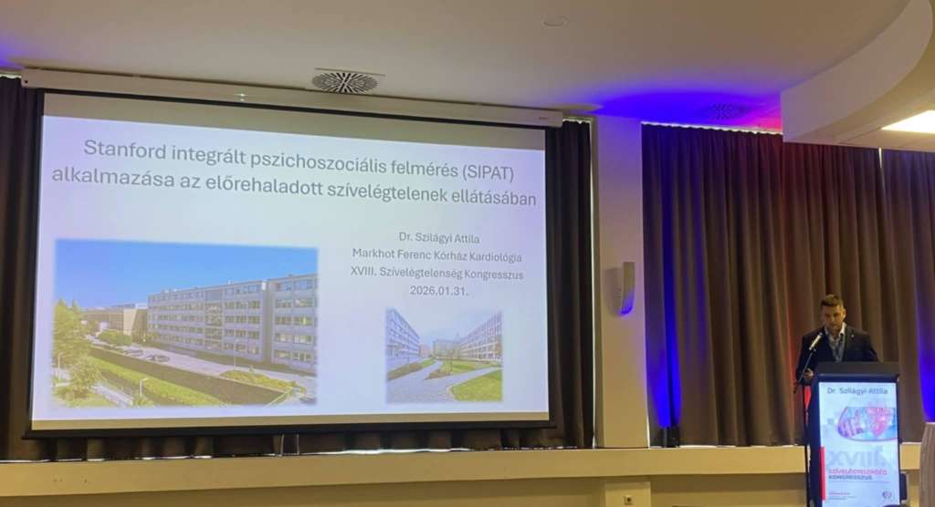 A Heves Vármegyei Markhot Ferenc Oktatókórház és Rendelőintézet Kardiológiai osztályának osztályvezető főorvosa dr. Szilágyi Attila, a konferencián nagy sikerű előadást tartott a„Stanford integrált pszichoszociális felmérés (SIPAT) alkalmazása az előrehaladott szívelégtelenség ellátásban” címmel.
