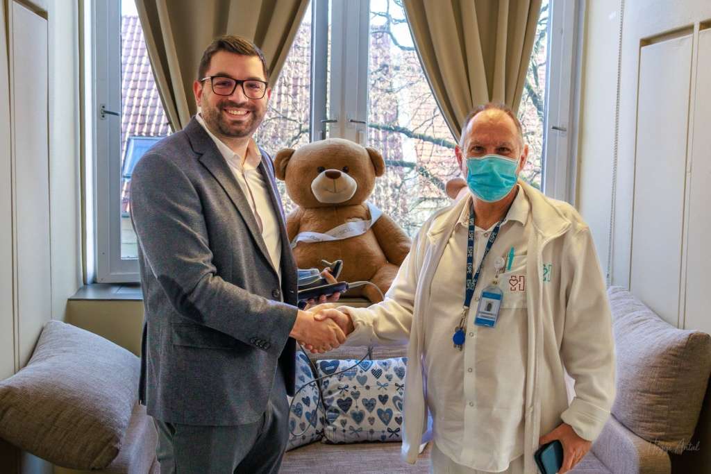 A készüléket ünnepélyesen Dr. Mátrai Zsolt osztályvezető főorvos vette át, majd munkatársaival együtt el is végezték az első próba vizsgálatot.